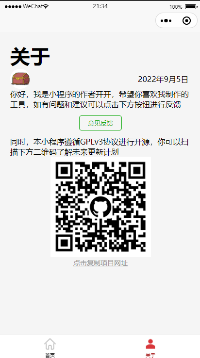 作为本项目首篇开发记录,将主要介绍项目基本情况,「主页」和「关于」页面制作,以及小程序开发过程中遇到的一些小坑。